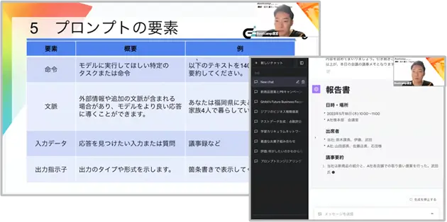 プロンプト構築支援企業の生成AI導入・活用支援を行うAIプロフェッショナルが生成AI研修を担当。業務の棚卸や実務で使えるプロンプト開発も支援。